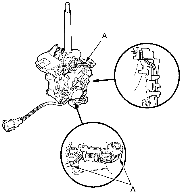 6. Route the harnesses as shown. Take the slack out of the harnesses, and secure the harnesses with the harness wire ties (A).