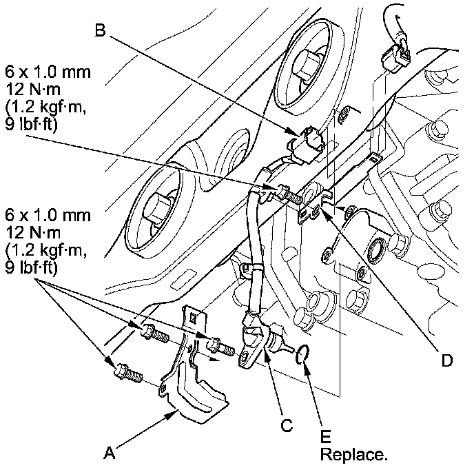 4. Install the rear differential fluid temperature sensor with a new O-ring (E) in the reverse order of removal.