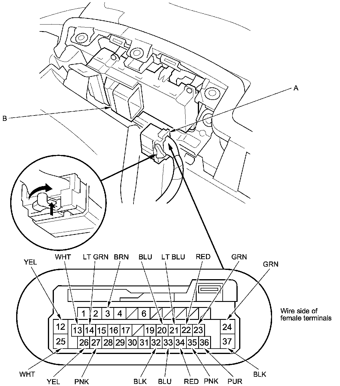 2. Disconnect the power window master switch 37P connector (A) from the power window master switch (B).
