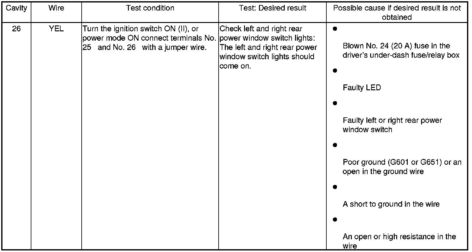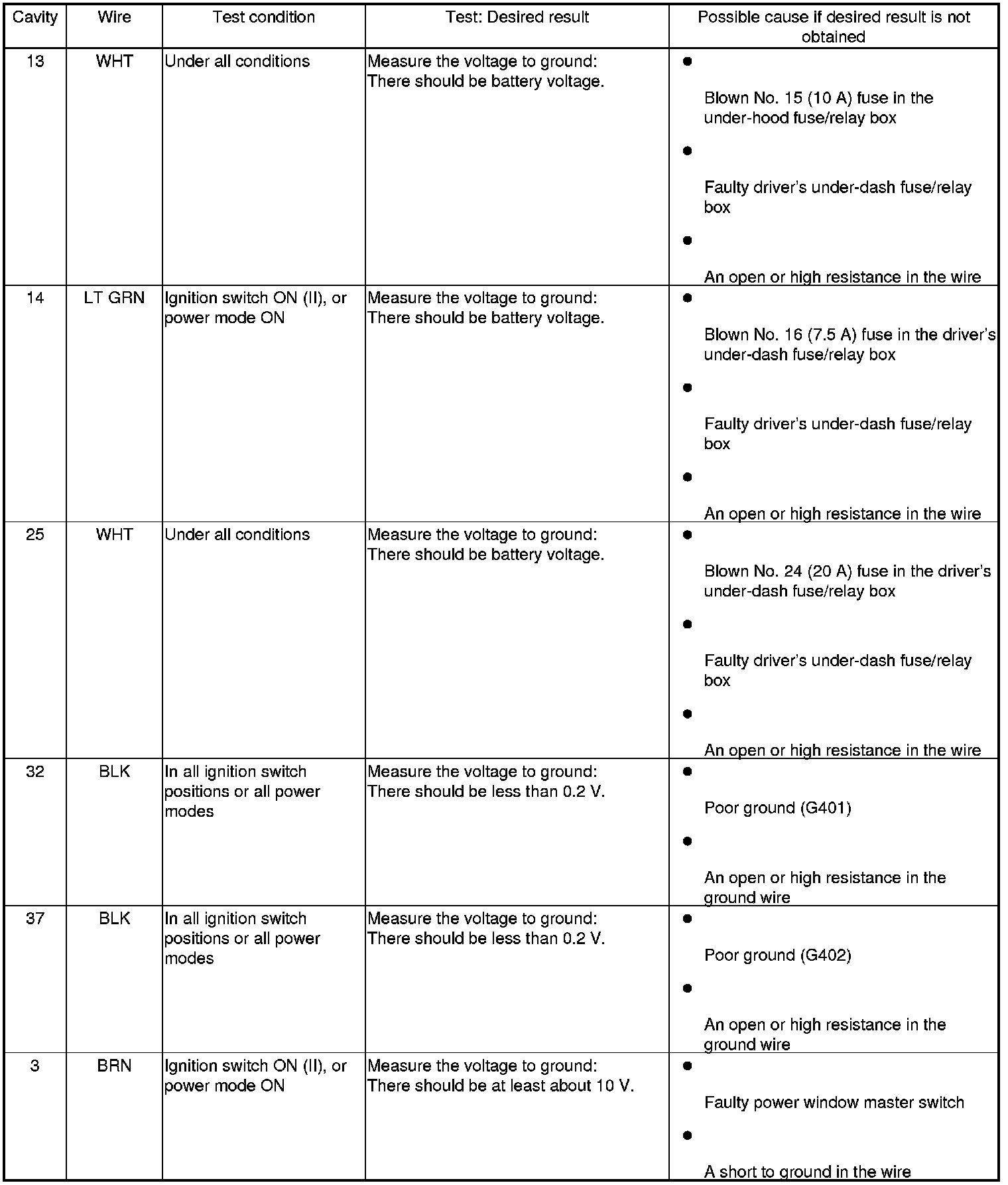 5. With the power window master switch 37P connector still disconnected from the power window master switch, do the following input tests:
