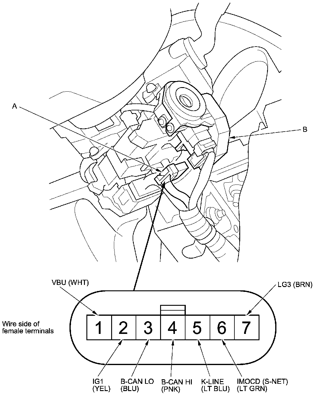 2. Disconnect the 7P connector (A) from the immobilizer-keyless control unit (B).