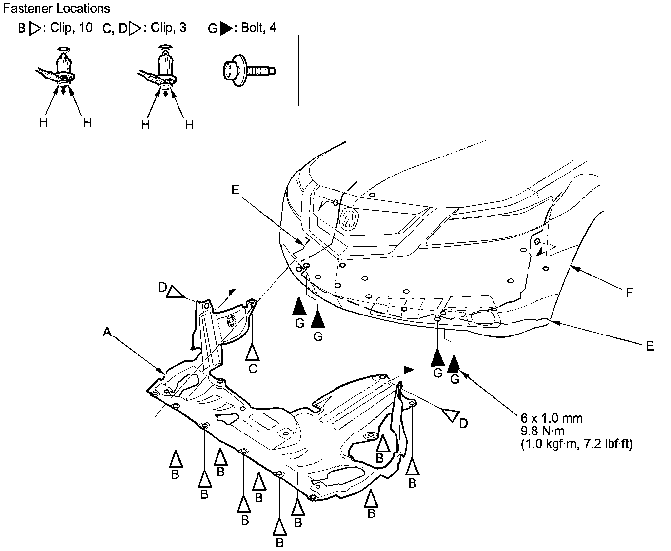 3. From under the front bumper (F), remove the bolts (G) that secure the front bumper, and the front splash shield to the body.