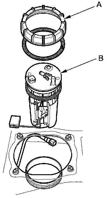 7. Remove the locknut (A) and the fuel tank unit (B).