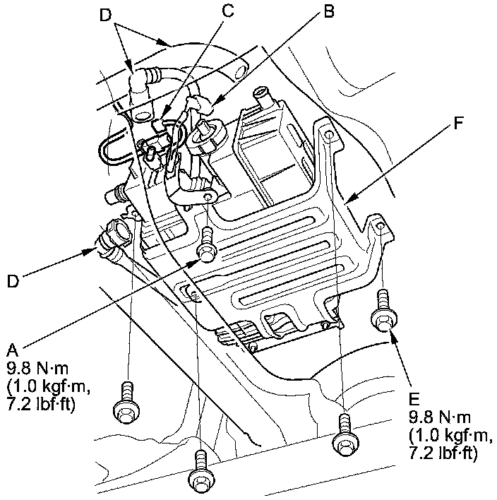2. Remove the bolts (E), and move the EVAP canister assembly (F) to the rear.