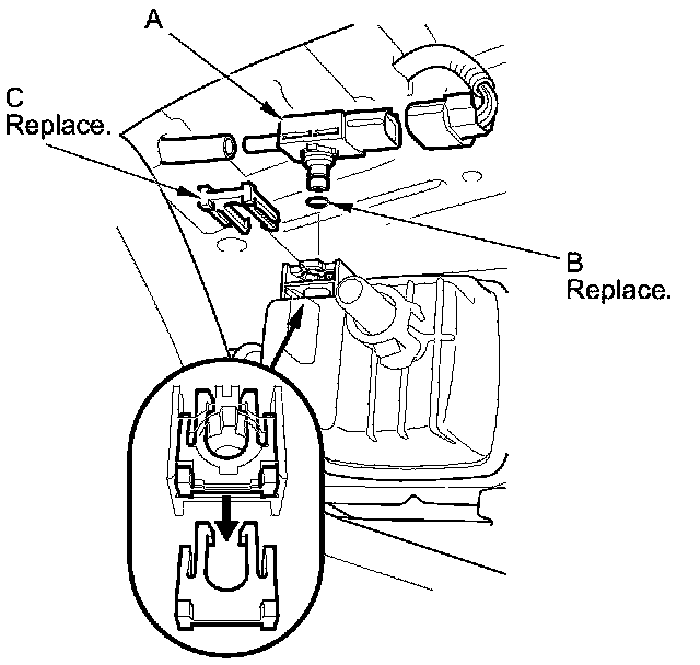 4. Install the parts in the reverse order of removal with a new O-ring (B) and a new retainer (C).