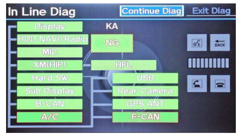 2. You may see the factory In-Line Diagnosis screen below. If so, do the following or this screen will return every time the vehicle is started. If not, go to step 3.