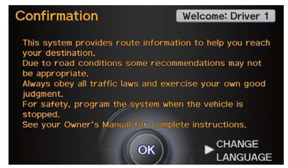 2. On the navigation system disclaimer screen, select OK by pressing the interface dial. (The interface dial is used to control several functions, including AcuraLink.)