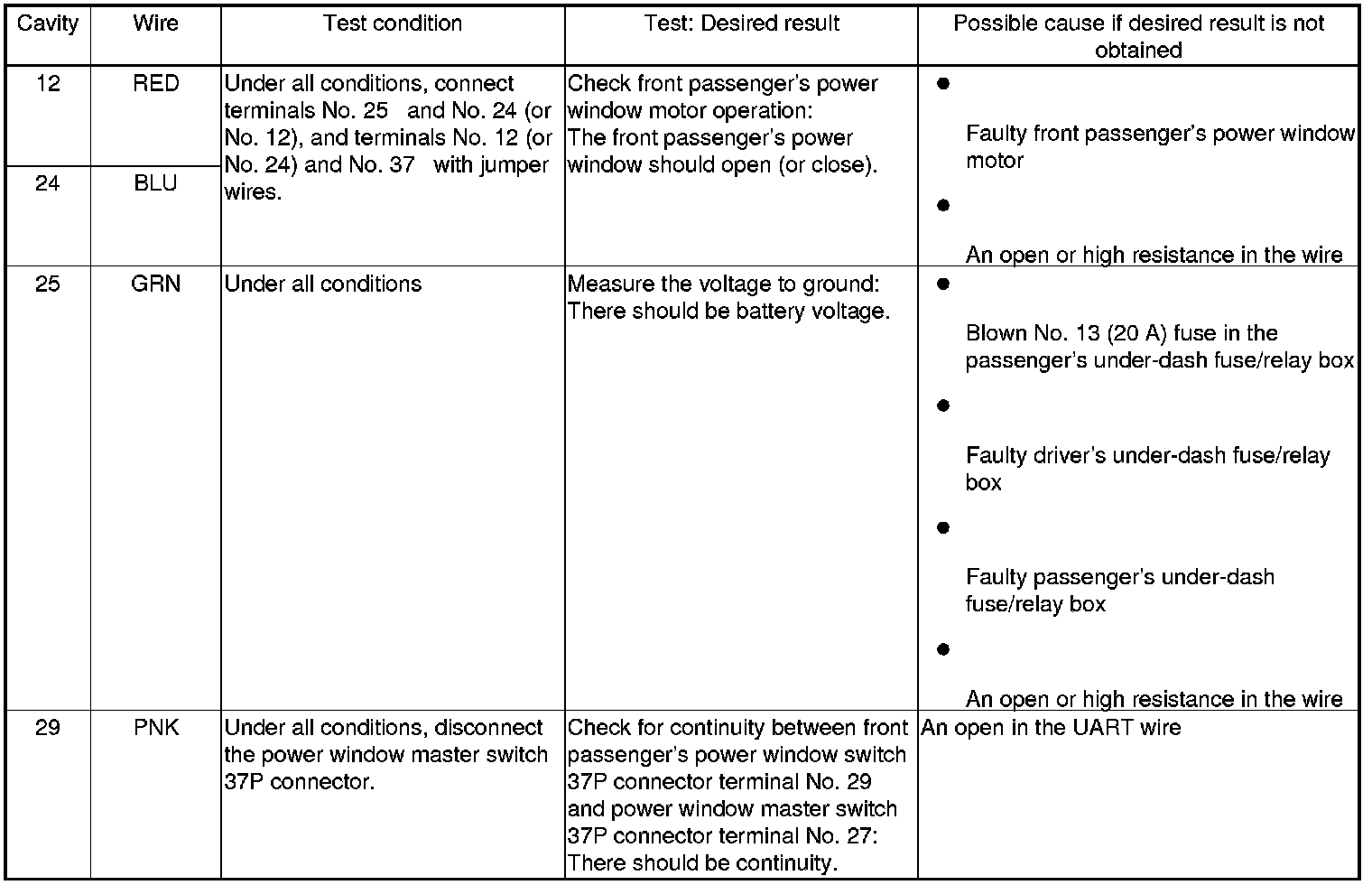 5. Reconnect the front passenger's power window switch connector to the front passenger's power window switch, and do the following input tests: