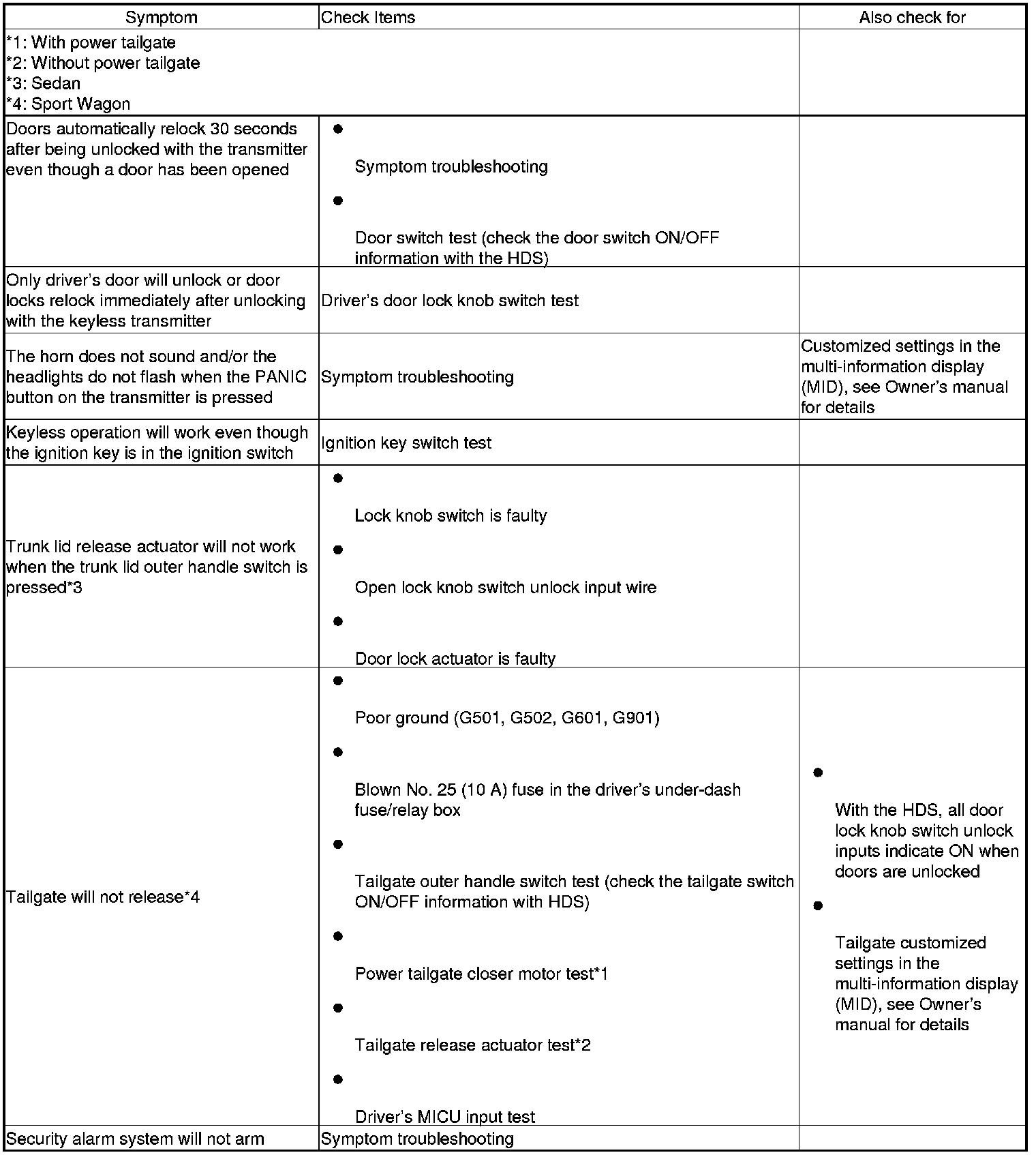 Keyless/Power Door Locks/Security System Symptom Troubleshooting Index
