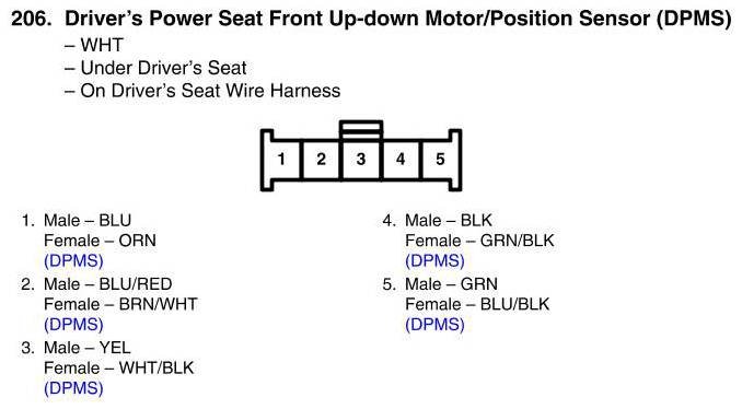 View 206 - Driver's Power Seat Front Up-Down Motor/Position Sensor Connector View (DPMS)