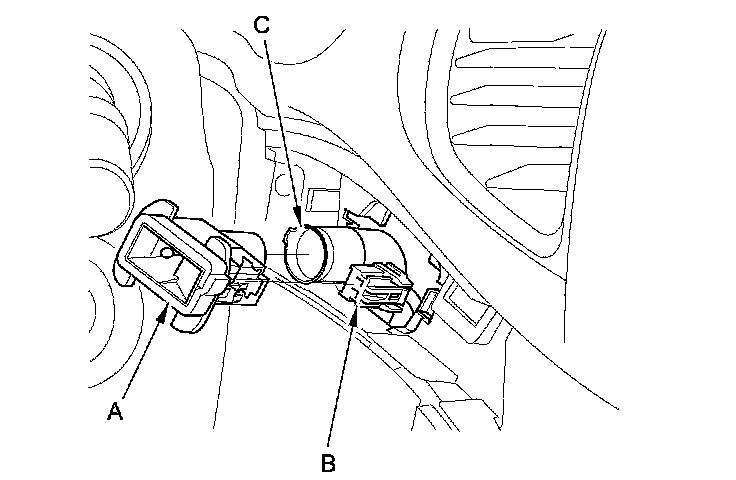 3. Pull out the in-car temperature sensor (A), disconnect the connector (B), and remove the in-car temperature sensor from the air hose (C).
