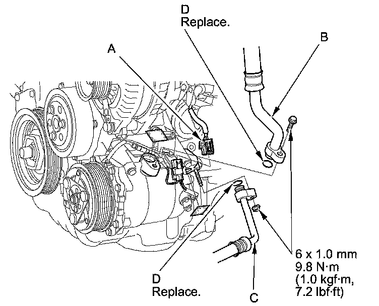 5. Disconnect the A/C compressor clutch connector (A). Remove the bolts and the nut, then disconnect the suction hose (B) and the discharge hose (C) from the A/C compressor. Remove the O-rings (D). Plug or cap the lines immediately after disconnecting them to avoid moisture and dust contamination.