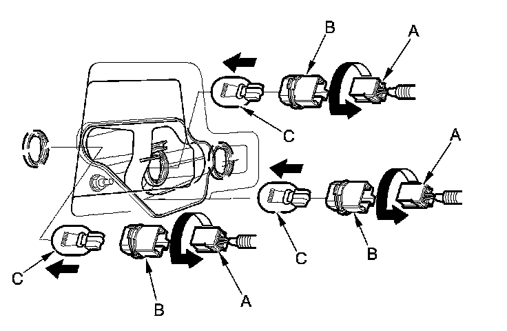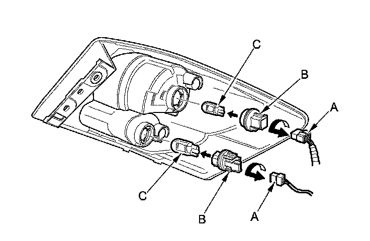 3. Turn the bulb sockets (B) 45 ° counterclockwise to remove the bulbs (C).