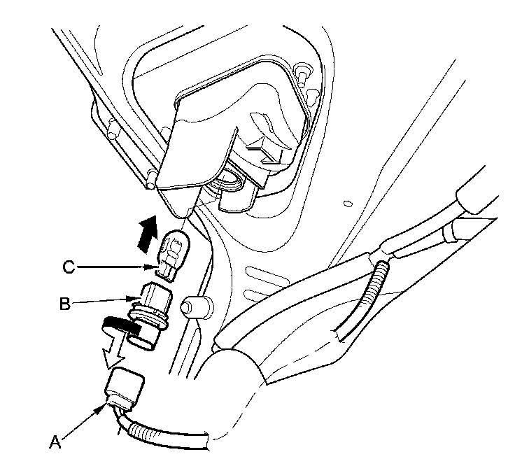 3. Turn the bulb socket (B) 45 ° counterclockwise to remove the bulb (C).