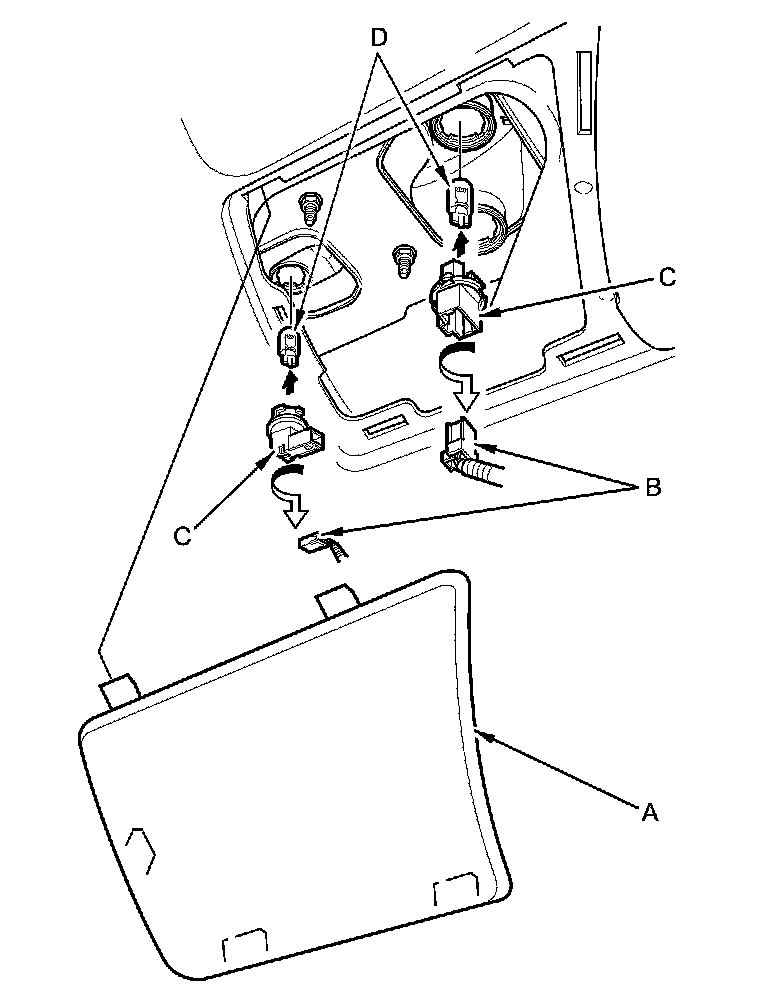 2. Turn the bulb sockets (C) 45 ° counterclockwise to remove the bulbs (D).