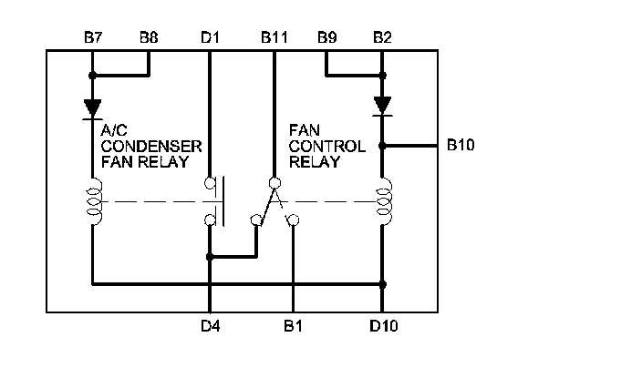There should be continuity between terminals B1 and B11 when battery power is connected to terminal B2 (B9, or B10), and battery ground is connected to terminal D10. There should be continuity between terminals B11 and D4 when power is disconnected.