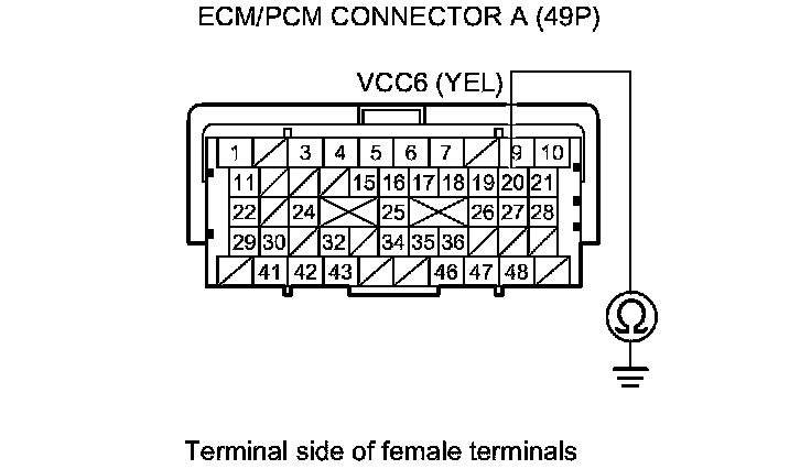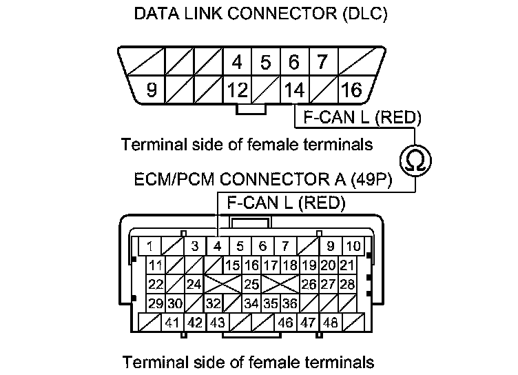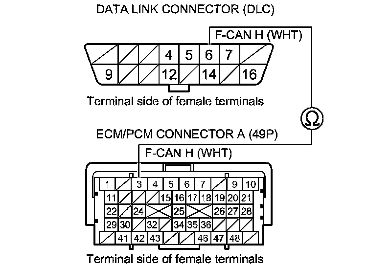 32. Check for continuity between ECM/PCM connector terminal A3 and DLC terminal No. 6.
