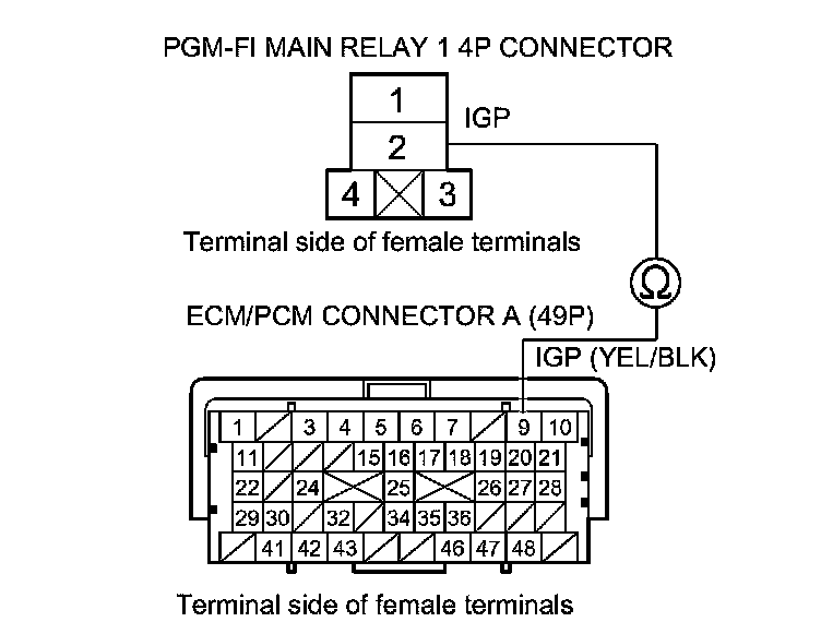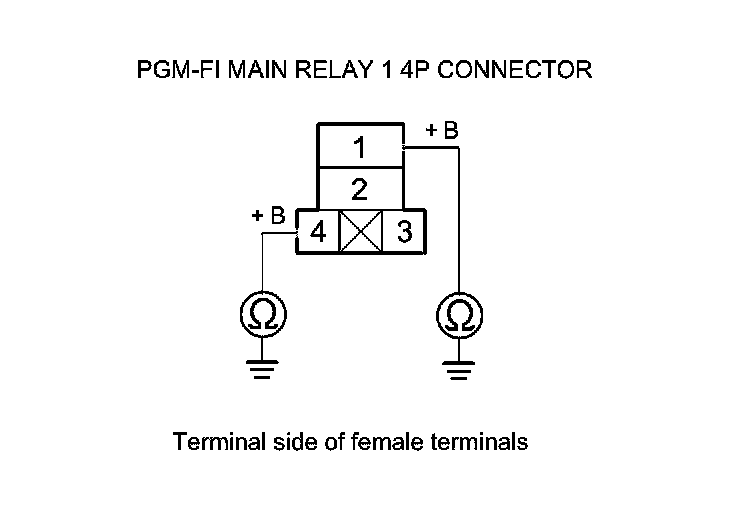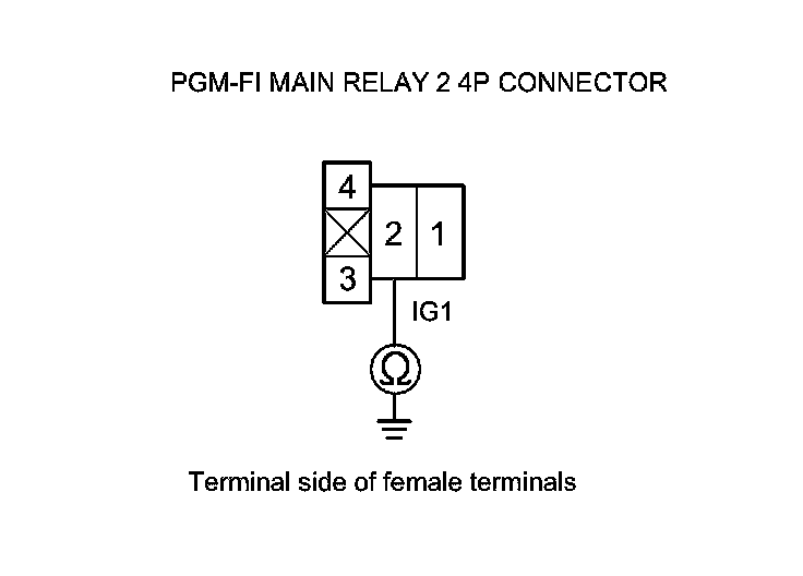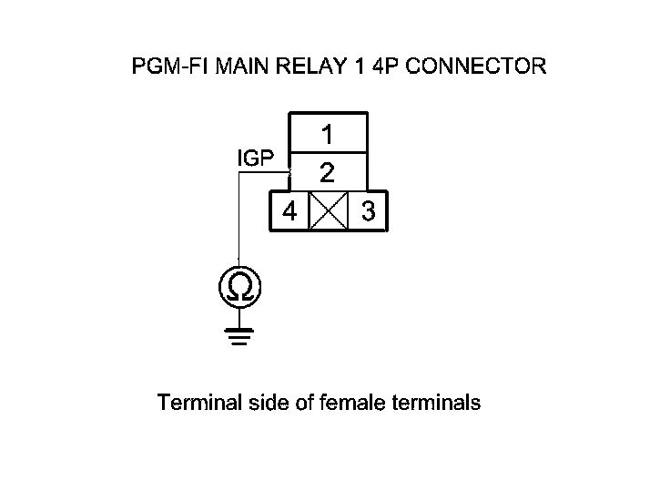 43. Check for continuity between PGM-FI main relay 1 4P connector terminal No. 2 and body ground.