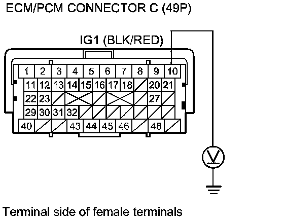 59. Measure the voltage between ECM/PCM connector terminal C10 and body ground.