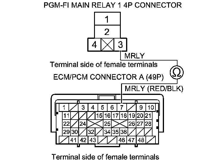 48. Check for continuity between PGM-FI main relay 2 4P connector terminal No. 2 and body ground.