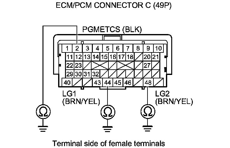 71. Check for continuity between body ground and ECM/PCM connector terminals B1, B10, C2, C44, and C48 individually.