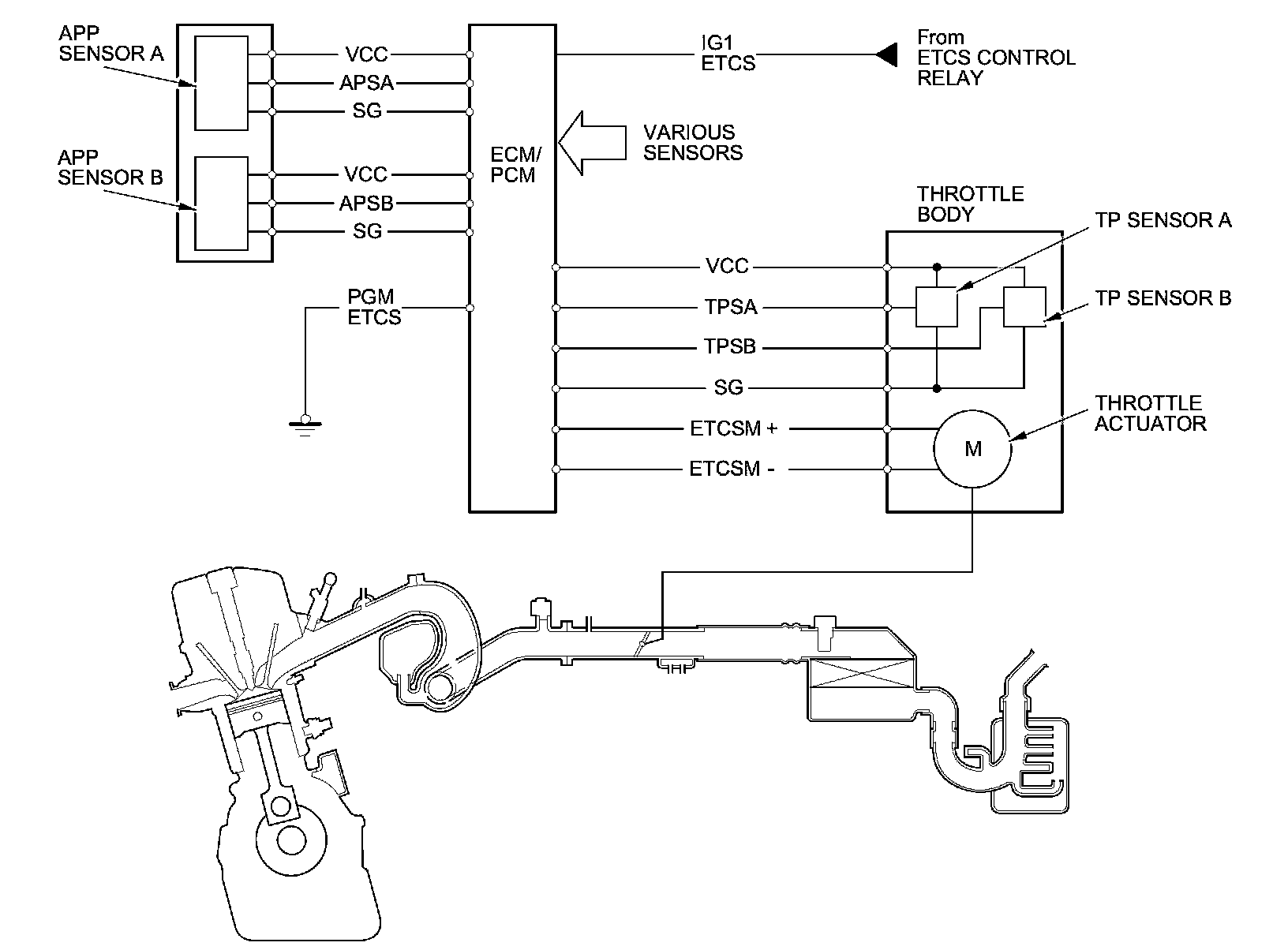 The electronic throttle control system consists of the throttle actuator, throttle position (TP) sensor A/B, accelerator pedal position (APP) sensor A/B, the electronic throttle control system (ETCS) control relay, and the ECM/PCM.