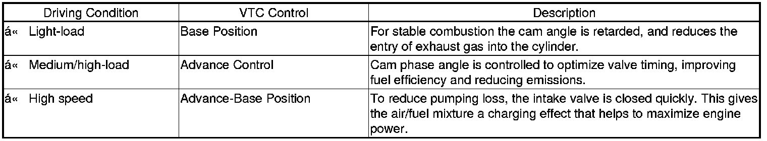 - The VTC system makes continuous intake valve timing changes based on operating conditions.