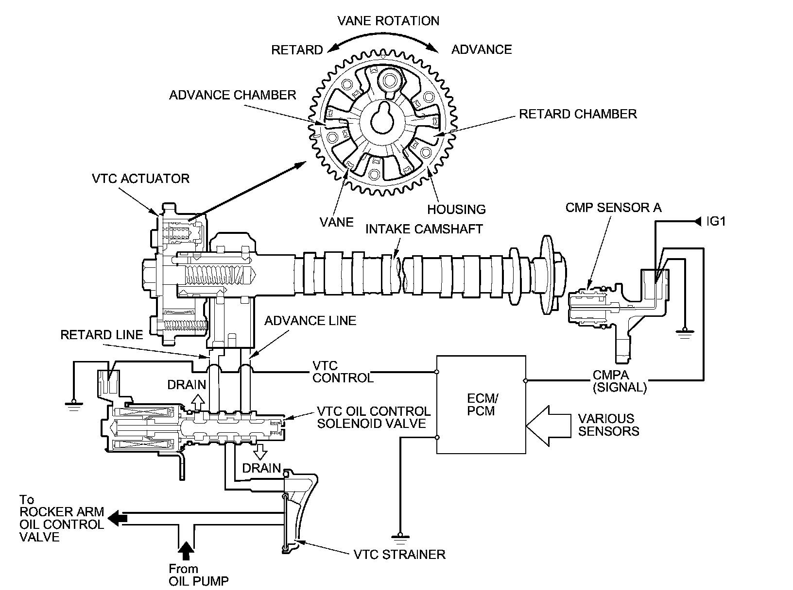 The VTC oil control solenoid valve controls oil pressure to the advance chamber/retard chamber of the VTC actuator according to a signal from the ECM/PCM. When the VTC actuator vanes rotate to the advance or retard position, the intake camshaft timing is changed.