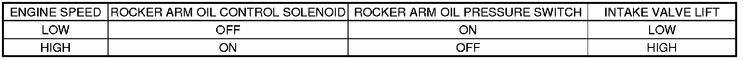 At low engine speed, the rocker arm oil control solenoid is turned off by the ECM/PCM. Oil pressure from the rocker arm oil control valve does not enter the intake rocker shaft. Each intake rocker arm is separated by a return spring and the intake secondary rocker arm is lifted by the low lift cam lobe.