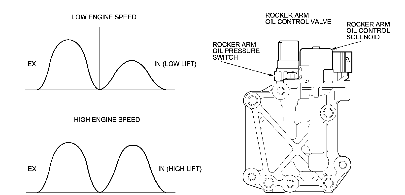 At high engine speed, the rocker arm oil control solenoid is turned on by the ECM/PCM. Oil pressure from the rocker arm control solenoid enters the primary intake rocker arm via the intake rocker shaft, and it moves the VTEC switching piston in the rocker arm.