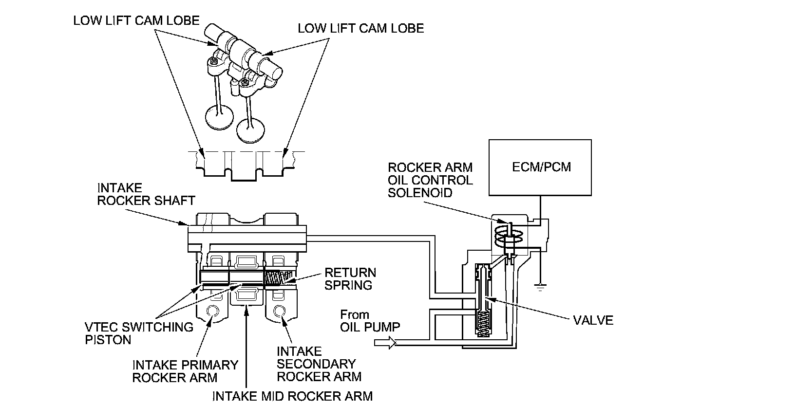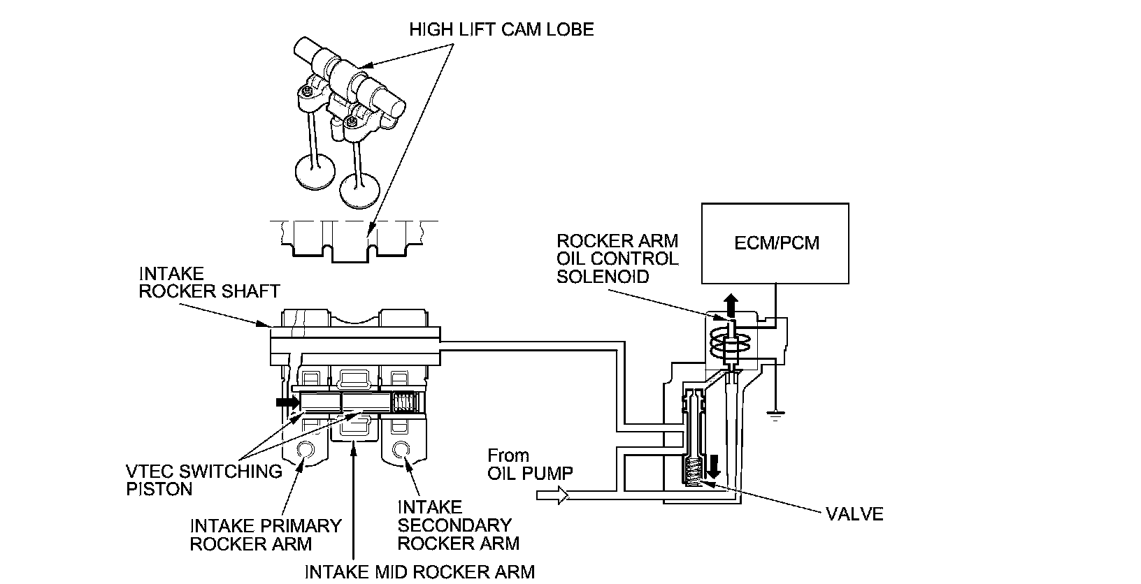 - The rocker arm oil control solenoid switches the intake valve side of the VTEC system on and off; the solenoid is controlled by the ECM/PCM.