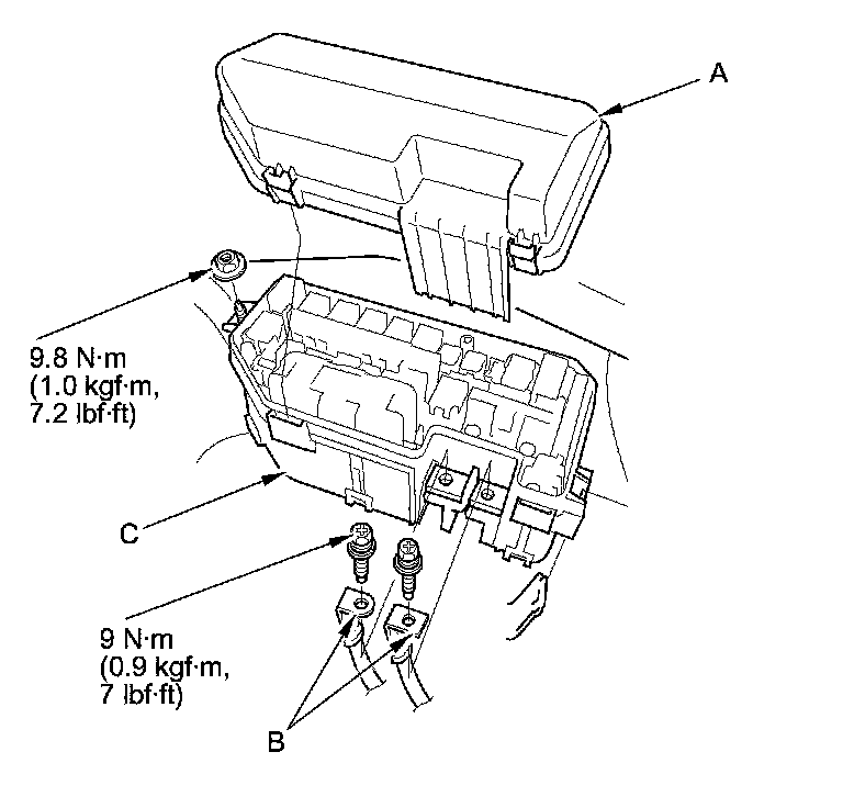 3. Remove the under-hood fuse/relay box (C) from the bracket.