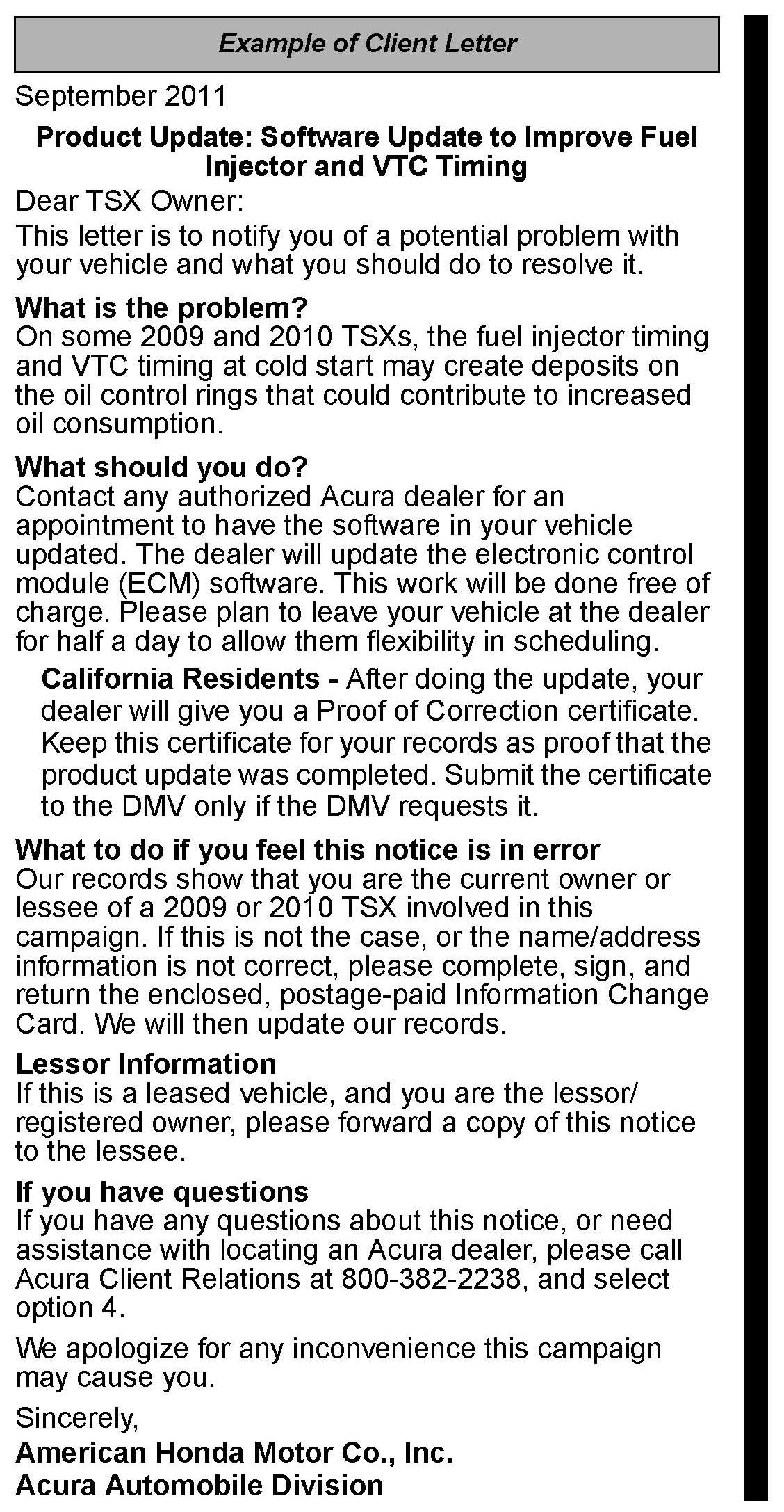 All owners of affected vehicles will be sent a notification of this product update. An example of the client notification is included at the end of this service bulletin.