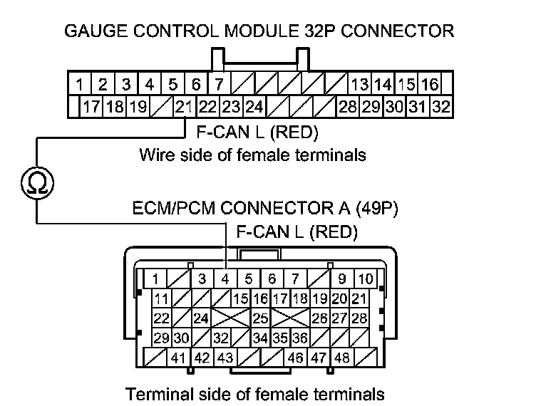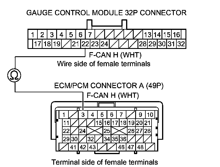 7. Check for continuity between ECM/PCM connector terminal A3 and gauge control module 32P connector terminal No. 22.