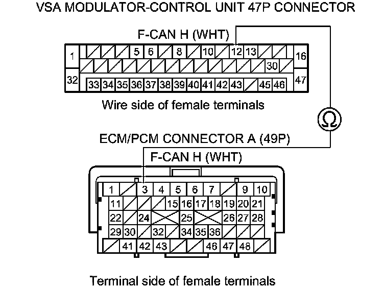 8. Check for continuity between ECM/PCM connector terminal A3 and VSA modulator-control unit 47P connector terminal No. 12.