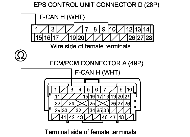 9. Check for continuity between ECM/PCM connector terminal A3 and EPS control unit connector D (28P).