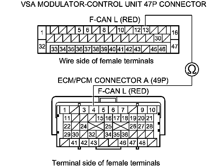 11. Check for continuity between ECM/PCM connector terminal A4 and VSA modulator-control unit 47P connector terminal No. 13.