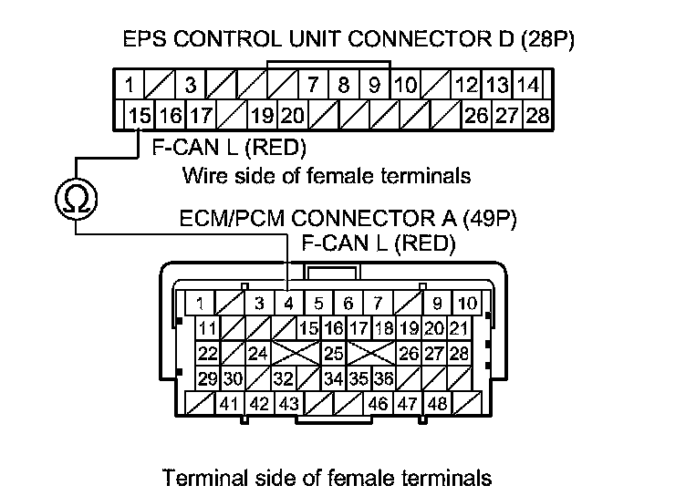 12. Check for continuity between ECM/PCM connector terminal A4 and EPS control unit connector D (28P) terminal No. 15.