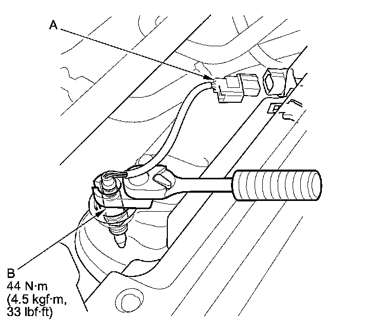 1. Disconnect the A/F sensor 4P connector (A), then remove the A/F sensor (B).