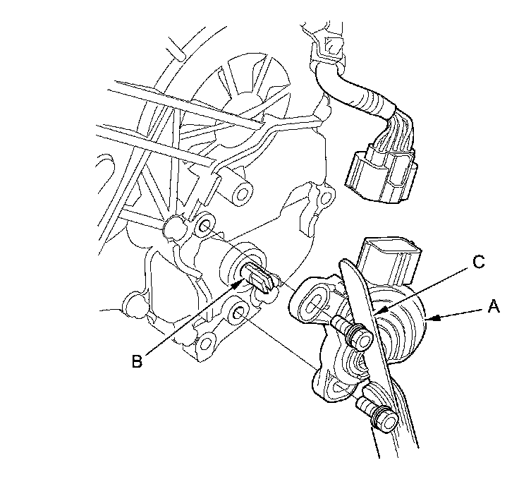8. Install the transmission range switch (A) gently on the selector control shaft (B) while holding it in the N position with the 2.0 mm (0.08 in) feeler gauge blade (C).