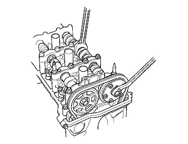 11. Remove the intake and exhaust camshafts while keeping some tension on the cam chain.