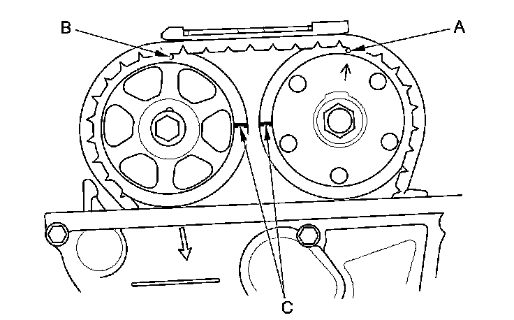 3. Set the No. 1 piston at top dead center (TDC). The punch mark (A) on the VTC actuator and the punch mark (B) on the exhaust camshaft sprocket should be at the top. Align the TDC marks (C) on the VTC actuator and the exhaust camshaft sprocket.