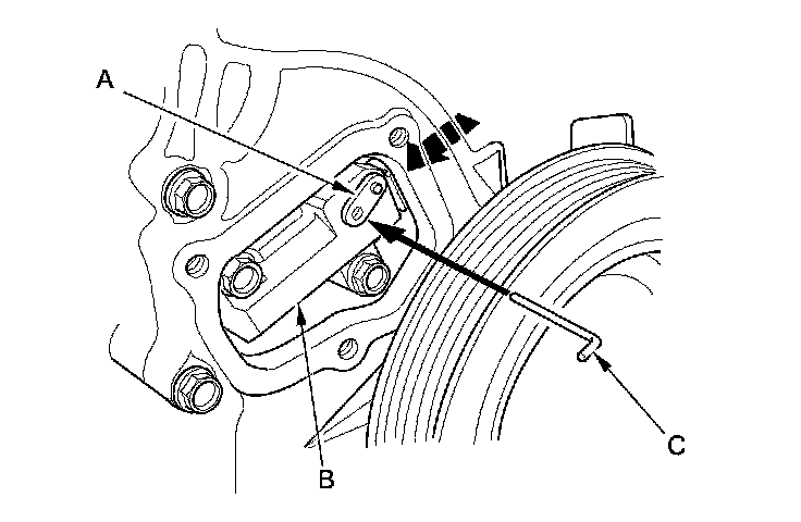 5. Rotate the crankshaft counterclockwise to align the holes on the lock (A) and the auto-tensioner (B), then insert a 1.2 mm (3/64 in) diameter pin (C) into the holes. Turn the crankshaft clockwise to secure the pin.