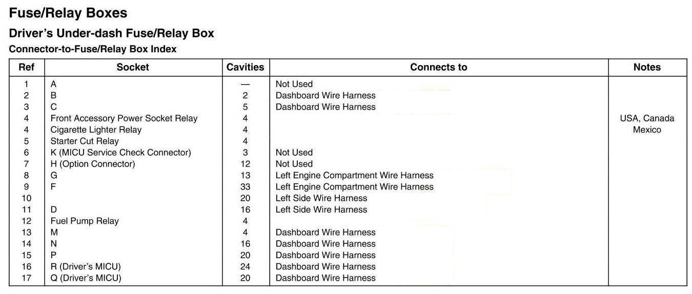 Driver's Under-dash Fuse/Relay Box - Connector-to-Fuse/Relay Box Index