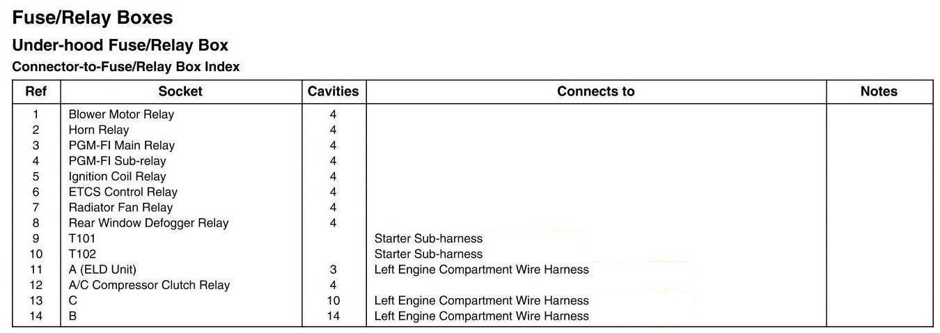 Under-hood Fuse/Relay Box - Connector-to-Fuse/Relay Box Index