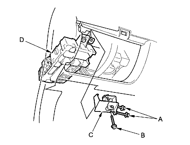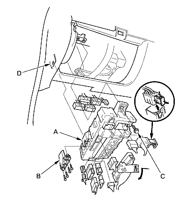 4. Remove the bracket from the driver's under-dash fuse/relay box (D).
