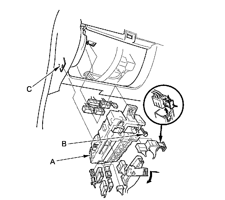 4. Remove the mounting bolt (B) and release the tab (C), and then pull the driver's under-dash fuse/relay box away from the body.