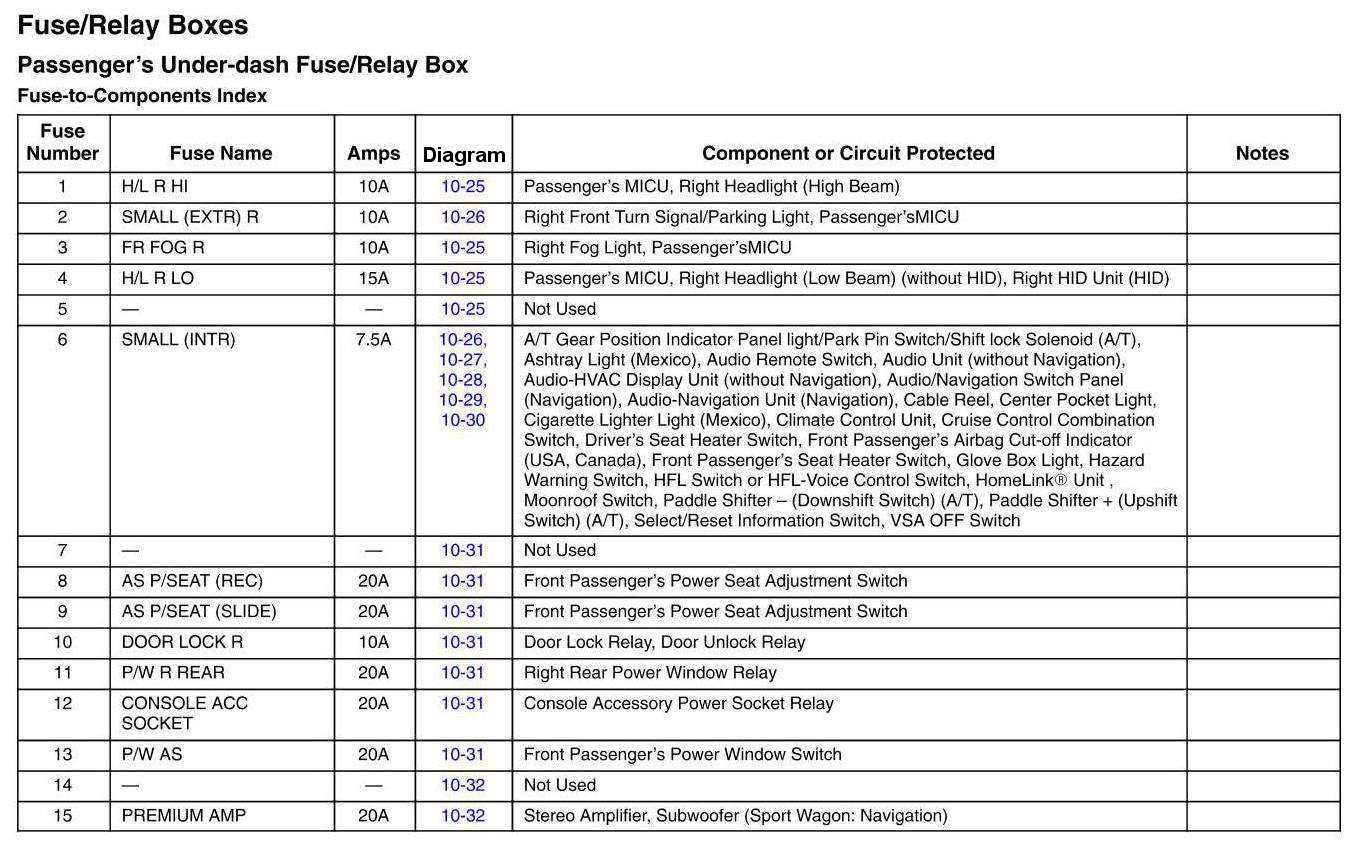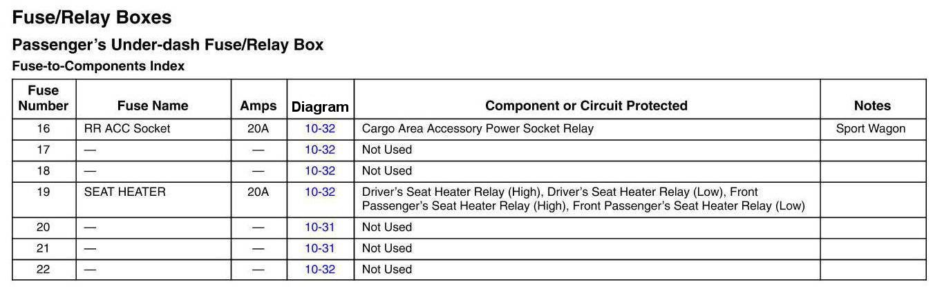 Passenger's Under-dash Fuse/Relay Box - Fuse-to-Components Index