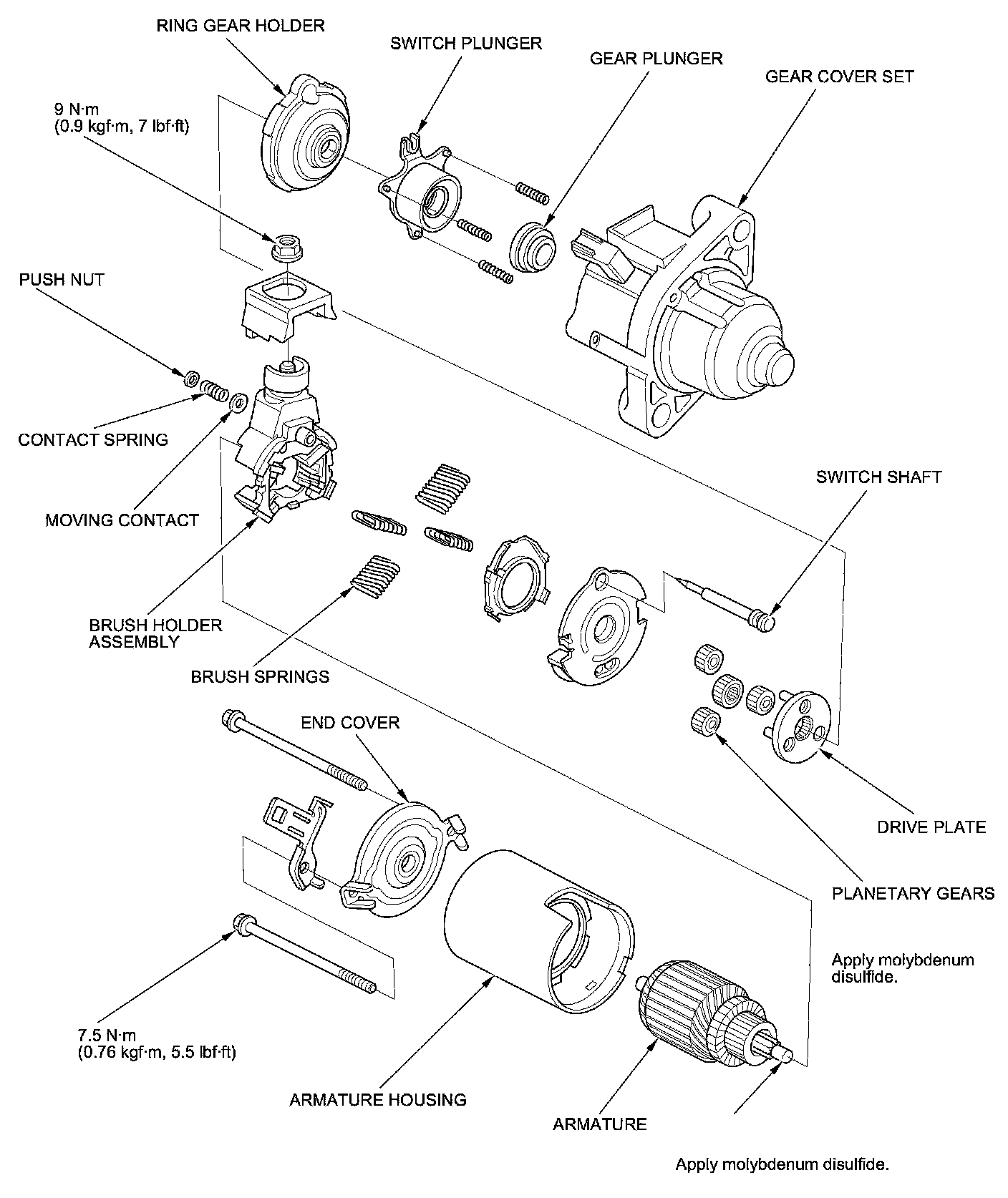 15. If the drive gear is worn or damaged, replace the overrunning clutch assembly; the gear is not available separately. Check the condition of the idler gear and the flywheel ring gear (M/T model) or the torque converter ring gear (A/T model) to see if the drive gear teeth are damaged.