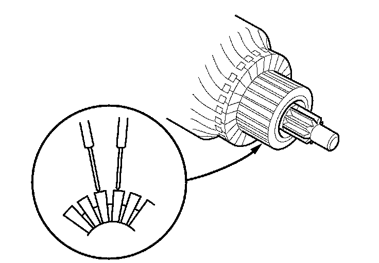 7. Use an ohmmeter to check for continuity between the segments of the commutator. If there is an open circuit between any of the segments, replace the armature.